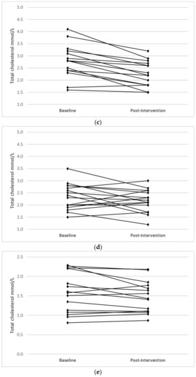 Individual changes for participants where main effects were noted (TC, LDL-C and HDL-C) are shown in Figure 1.
