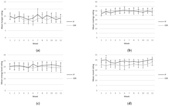 Weekly mean ratings for hunger (a), cravings (b), energy levels (c), mood (d) and compliance (e) over 12 weeks for CERT and IFT participants. IFT = Intermittent Fasting Diet Group, CERT = Continuous Energy Restriction Diet Group. * No overlap in 95% confidence intervals.