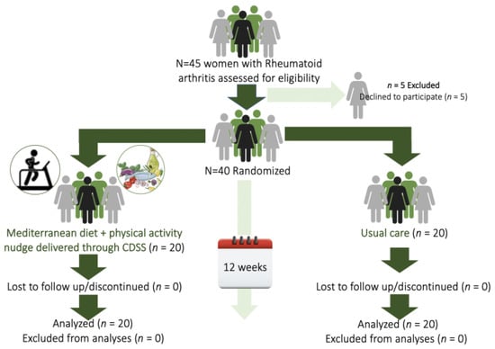 The Mediterranean DiEt In Rheumatoid Arthritis (MADEIRA) was a single-blind (statistician), two-arm randomized controlled trial, investigating the effects of a 12-week personalized lifestyle intervention including MD and PA promotion, versus usual care in women with RA. The study’s protocol was registered at the Center for Open Science Framework (OSF, https://www.shorturl.at/krW24, accessed on 22 January 2023). The reporting of the study follows the consolidated standards of reporting trials (CONSORT) statement [].