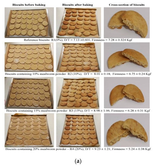 Biscuits are a ready-to-eat bakery product with a long shelf-life, and are traditionally prepared with wheat flour, honey, sugar, and fat. The high sugar content of biscuits makes them highly energetic products that contain a large amount of rapidly digested starch, which results in an elevated glycaemic index during digestion. Similar to honey or sugar, the high fat content of biscuits also gives them a high energy value []. The poor nutritional value of traditional biscuits is associated with the risk of developing metabolic or cardiovascular diseases []. Improving the nutritional value of biscuits for a healthy lifestyle is often achieved by the addition of fibre [], proteins [], or legume flour [,]. A recently explored solution to enhancing the nutritional value of biscuits is the addition of edible insect powders. The positive assessment recently issued by the European Food Safety Authority (EFSA) concerning the consumption of house crickets, yellow mealworms, and grasshoppers as novel foods [] has offered new opportunities for developing functional food. The increasing demand for high-protein, low-fat, and economical food sources, along with shifting trends in dietary needs, is likely to stimulate the edible insect market. The edible insect market is growing; it exceeded USD 112 million globally in 2019 and is forecast to grow at a compound annual growth rate of over 47% between 2019 and 2026 []. Due to their high bioactive compound content, which includes essential amino acids, unsaturated fatty acids, and fibre, as well as their low carbohydrate content [,], insect powders may be a solution to alleviating the nutritional imbalance of traditional biscuits.