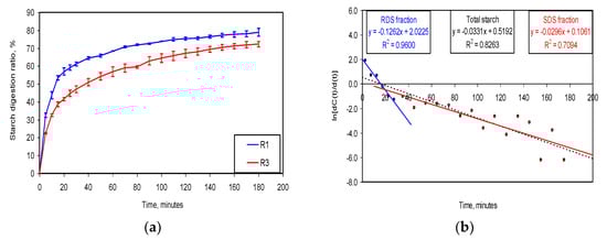 (3) In both kinetic models, the rate coefficients assigned to the RDS fraction were lower in the R3 biscuits compared to R1, but only the LOS model showed a statistically significant difference (p < 0.05) between them. No significant differences occurred between the rate coefficients regarding the digestion of the SDS fraction.