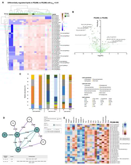 Overview of serum lipidomics in children with obesity after interventions aimed at weight loss. (A) A heatmap plot depicting significantly differentially regulated lipid species between 0 and 6 months of intervention and sample clustering in the pediatric (PE) cohort. (B) A volcano plot of statistically significant differentially regulated lipid species (6 M-0 M) in the PE cohort. Lipids are shown in a darker green tone for adjusted p-value < 0.01, and the absolute logarithmic fold change is >0.5 units. The most significant and regulated lipids are specifically labelled. (C) Relative abundance of upregulated and downregulated lipid species between 0 and 6 months in the PE cohort, classified according to top represented lipid superfamilies (left), main classes (center), and subclasses (right). (D) The pathway of phospatidylinositol biosynthesis activation 0 M-6 M from phosphatidic acid derived from diacylglycerols or phosphatidylcholine in the PE cohort. Interpretation information for each node and arrow shape and color is included. A measure of the effect is indicated for each arrow (Z-score values). Statistical analyses for paired data were performed, establishing p < 0.05 as the significance threshold. Significantly regulated pathways are indicated with a shaded arrow. For each pathway analysis, a table depicting the specific statistically significant reaction steps affected in the pathway, their associated Z-score, and predicted regulated genes involved in each step is included. (E) A heatmap depicting correlation coefficient (r) values for linear regressions between the differences of selected clinical variables and those of top significantly regulated lipids in the PE cohort after metabolic intervention (Δ6 M-0 M). Blue cells indicate positive (r > 0) and red cells indicate negative associations (r < 0). *: Significant correlations (p < 0.05).