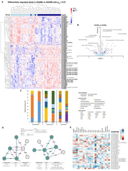 Significant changes in serum lipid composition of the AD cohort were also observed after 6 M of intervention (Figure 2A); 193 lipid species showed differential serum concentrations (118 upregulated and 75 downregulated). Specifically, PC(O-34:2)/PE(O-37:2), PC(O-36:5), PC(O-36:4), PC(O-36:2)/PE(P-39:1), and TG(53:2) were the lipids the circulating levels of which increased the most, while DG(36:5), TG(54:6), TG(54:6), DG(42:7), and PG(44:0) were the ones of which the circulating levels decreased the most (Figure 2B). The top-upregulated lipid superfamily/main class/subclass were glycerophospholipids, glycerophosphocholines, and phosphatidylcholines (PC) (Figure 2C), while the most downregulated were glycerolipids, di/triradylglycerols, and triacylglycerol/diacylglycerols.