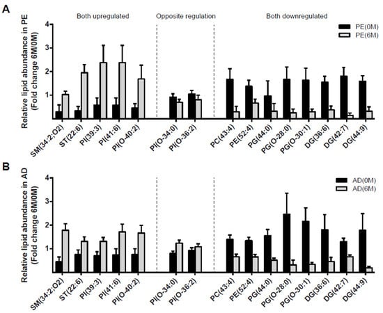 Coincident regulated lipid species in the PE and AD cohorts. Relative abundance (fold change 6 M-0 M) at 0 M (grey bars) and 6 M (black bars) of the 15 upregulated, oppositely regulated, or downregulated lipid species in both cohorts in the PE (A) or AD (B) cohort data. All results shown are statistically significant 6 M vs. 0 M (paired padj < 0.05).