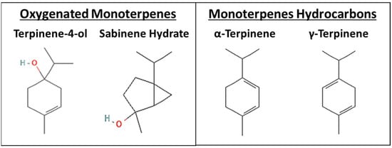 OMEO was purchased from Pranarom Scientific Aromatherapy (Paris, France). Based on the composition provided by the company, four monoterpenes are the main constituents of this essential oil. They are found at a concentration of 21.8% for terpinene-4-ol, 9.7% for sabinene, 10.51% for alpha-terpinene, and 16.37% for gamma-terpene. Terpinen-4-ol, ϒ-terpinene, and sabinene hydrate were sourced from HWI Pharma Services (Ruelzheim, Germany), and α-terpinene was purchased from Sigma Aldrich (Saint Louis, MO, USA).