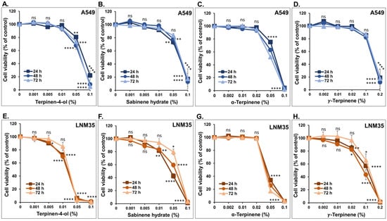 Effect of the four monoterpenes on NSCLC cellular viability in vitro. A549 (A–D) and LNM35 (E–H) cells were treated with increasing concentrations of terpinen-4-ol, sabinene hydrate, α-terpinene, or γ-terpinene for 24, 48, and 72 h. Cellular viability was determined as described in the materials and methods. Experiments were repeated at least three times. Shapes represent mean and bars represent S.E.M. * p < 0.05, ** p < 0.01, *** p < 0.001, and **** p < 0.0001; ns—non-significant.