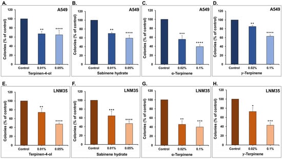 Subsequently, we aimed to further investigate the in vitro activity of these monoterpenes using a colony growth assay. For this, the formed colonies of A549 and LNM35 were treated with two different concentrations of terpinen-4-ol, sabinene hydrate, α-terpinene, or γ-terpinene for 1 week. These four monoterpenes markedly decreased the total number of A549 (Figure 3A–D) and LNM35 (Figure 3E–H) colonies.