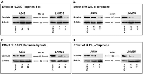 To assess whether the anticancer effect of the most abundant monoterpenes in OMEO is also mediated via survivin regulation in NSCLC cells, we treated our cells with the indicated concentrations of these monoterpenes for 24–48 h. As shown in Figure 5A–D, treatment with terpinene-4-ol, sabinene hydrate, α-terpinene, and γ-terpinene resulted in a reduction of survivin expression in both A549 and LNM35 cells. Notably, terpinene-4-ol reduced survivin expression starting at 48 h for A549 and LNM35 (Figure 5A), while sabinene hydrate decreased expression at 48 h for A549 and 24 h for LNM35 (Figure 5B). Almost similar results were obtained with α-terpinene (Figure 5C) and γ-terpinene (Figure 5D). Altogether, our results point to survivin as a potential target of these monoterpenes in NSCLC cells.