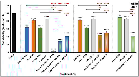 Effect of monoterpene combinations on NSCLC cellular viability in vitro. A549 cells were treated with different concentrations of monoterpenes alone or in combination for 48 h. Cellular viability was assessed using CellTiter-Glo Luminescent Assay as described in the materials and methods. Experiment was repeated at least three times. Columns represent means, and bars represent S.E.M. **** p < 0.0001. ns—non-significant. Black stars indicate significance in comparison to the control; red stars indicate significance between groups.