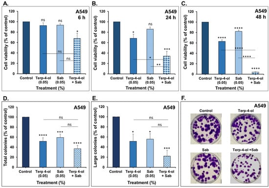 Effect of terpinen-4-ol in combination with sabinene hydrate on A549 viability and colony growth in vitro. (A–C) A549 cells were treated with terpinen-4-ol, sabinene hydrate, or a combination for 6, 24, and 48 h. Cellular viability was determined as described in the materials and methods. (D–F) A549 number of total and large colonies treated with terpinen-4-ol, sabinene hydrate, or a combination for 7 days. Experiments were repeated at least three times. Columns represent mean and bars are S.E.M. * p < 0.05, ** p < 0.01, *** p < 0.001, and **** p < 0.0001. ns—non-significant.