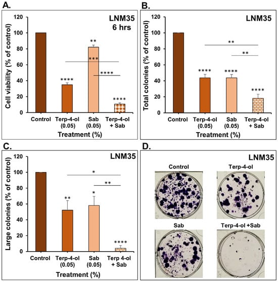 The effect of the combination of terpinen-4-ol and sabinene hydrate on cellular viability was assessed at short intervals in A549 and LNM35 cells. For A549 cells, neither of the monoterpenes alone significantly reduced cell viability after 6 h of treatment, but their combination led to a significant decrease of around 30% (Figure 7A). This inhibitory effect became more pronounced at 24 h and 48 h, with reductions of 60% and 96%, respectively (Figure 7B,C), indicating a time-dependent action of these combined monoterpenes. Additionally, the combination enhanced the inhibitory effect of each of the monoterpenes on both the total number and the size of A549 colonies, although statistical significance was not reached (Figure 7D–F).