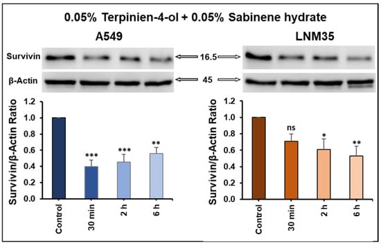 We assessed the level of survivin in A549 and LNM35 cells treated with the combination of terpinen-4-ol and sabinene hydrate for short incubation times. As shown earlier in Figure 5, terpinen-4-ol or sabinene hydrate decreased survivin expression at 48 h, suggesting the absence of effect within shorter incubation periods. Figure 9 demonstrates that the combination of these two monoterpenes can downregulate survivin expression in both cell lines starting at 30 min after treatment. These results suggest that the anticancer effect of this combination is, at least partly, mediated through survivin downregulation. Given the crucial role of survivin in cancer cell survival and drug resistance, its downregulation is a promising target for anticancer therapy.