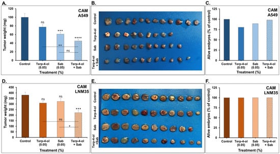 Effect of the combination of terpinen-4-ol and sabinene hydrate on NSCLC tumor growth in CAM. (A,B) Weight of A549 tumors xenografted on CAM and treated with or without terpinen-4-ol, sabinene hydrate, or a combination for 1 week. (C) Percentage of alive embryos in the A549 control and treated groups. (D,E) Weight of LNM35 tumors xenografted on CAM and treated with or without terpinen-4-ol, sabinene hydrate, or a combination for 1 week. (F) Percentage of alive embryos in the LNM35 control and treated groups. Columns are means; bars are S.E.M. * p < 0.05, ** p < 0.01, *** p < 0.001, and **** p < 0.0001. ns—non-significant.