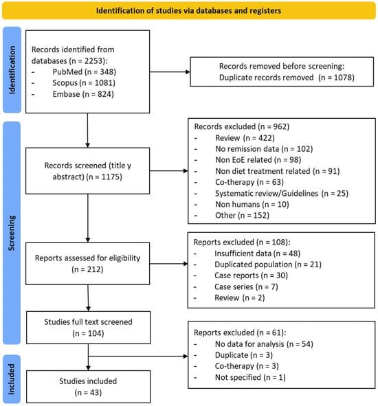 Overall, our search strategy retrieved a total of 2252 documents, with 1174 remaining documents once duplicates were removed. After title and abstract examination, 962 documents were excluded since they did not meet inclusion criteria. This yielded 212 potentially relevant documents (Figure 1), of which 43 documents, including 38 full papers [,,,,,,,,,,,,,,,,,,,,,,,,,,,,,,,,,,,,,] and 5 abstracts [,,,,], were eventually included. These studies combined 2825 EoE patients from 15 different countries. Among them, 136 did not complete the dietary protocol and were excluded from per protocol meta-analyses. As for the study design, 21 were prospective observational studies [,,,,,,,,,,,,,,,,,,,,], 19 were retrospective [,,,,,,,,,,,,,,,,,,], and 3 were randomized controlled trials [,,]. The sample size of EoE cohorts varied between 4 and 470 patients.