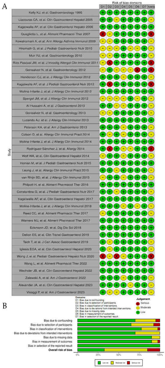 Risk of bias of observational studies included in the systematic review according to the Cochrane ROBINS-I tool. (A), ‘Traffic light’ plots of the domain-level judgments for each individual result [,,,,,,,,,,,,,,,,,,,,,,,,,,,,,,,,,,,,,,,]. (B), Weighted bar plots of the distribution of risk of bias judgements within each bias domain.