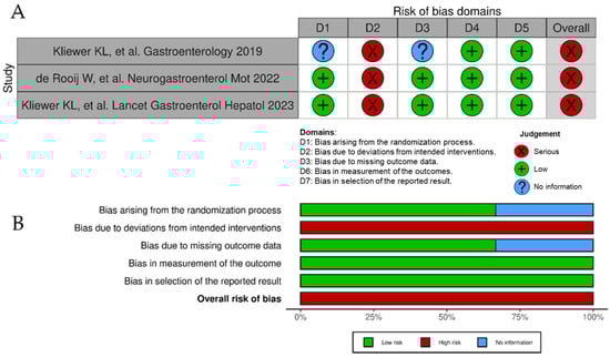 Risk of bias of randomized controlled trials included in the systematic review according to the Cochrane RoB 2 tool. (A), ‘Traffic light’ plots of the domain-level judgments for each individual result [,,]. (B), Weighted bar plots of the distribution of risk of bias judgements within each bias domain.