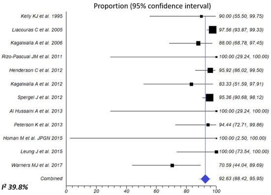 | Rizo-Pascual JM et al., 2011 [] | Prospective | 2001–2009 | Spain | 17 (14) | Children (2.8–14.5) | 82.4/17.6 | Elemental | 8 | 3/3 (100%) | 3/3 (100%) | Asymptomatic |