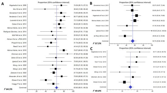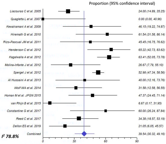 Elimination diet based on withdrawal of foods showing a positive result in either blood or skin allergy testing was assessed in 16 different cohorts, including 682 patients (572 children and 100 adults). Effectiveness to achieve histological remission was 39.5% (95% CI, 30.3–49.2%: I2 78.8%) (Figure 6). A trend towards statistical significance was observed when comparing children to adults (45.7% vs. 26.4%, respectively; p = 0.063; very low of certainty evidence for both age groups), while there was a significant difference in favor of retrospective studies (47.5% vs. 24.2%; p = 0.012) (Table 2).