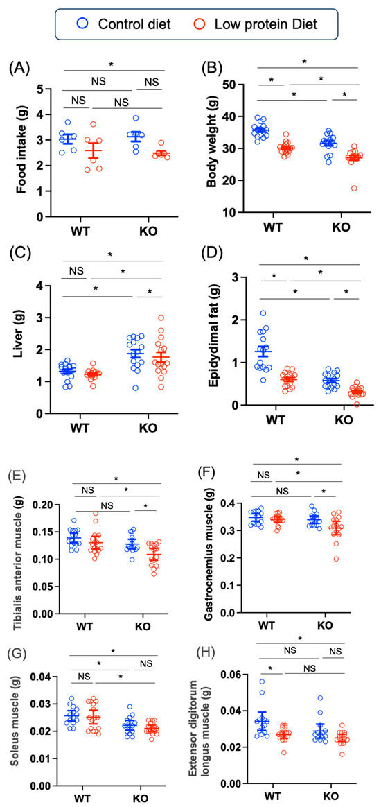 Chrebp KO mice are known to have decreased epidydimal fat weight and increased liver weight due to a decrease in de novo lipogenesis and hepatic glycogen accumulation. However, the effects of a low-protein diet on KO mice remain unknown.