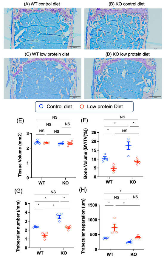 Next, we performed trabecular bone morphometric analysis (Figure 7A–O). In the control diet group, the bone volume (BV/TV (%)) and the number of trabeculae (mm) in the KO group were greater than those in the WT group (BV/TV WT control–KO control: −7.1 [−12.7, −1.6], p = 0.011; number of trabeculae WT control–KO control: −1.1 [−1.8, −0.5], p = 0.0008). Low-protein diet feeding led to a decrease in the bone volume (WT control—WT low-protein: 5.8 [0.2, 11.4], p = 0.04]; KO control—KO low-protein: 9.0 [3.3, 14.5], p = 0.002) and the number of trabeculae (WT control—WT low-protein: 1.0 [0.3, 1.6], p = 0.003; KO control—KO low-protein: 1.2 [0.6, 1.9], p = 0.0004) in both WT and KO mice (Figure 7A–G). Consistent with these findings, the degree of trabecular separation in the KO group was lower than that in the WT group under low-protein diet conditions (WT low-protein—KO low-protein: 326.6 [55.5, 597.7], p = 0.02) (Figure 7H).