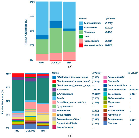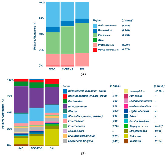 The results showed that Actinobacteriota had the highest relative abundance in the HMO (60.4%) and BM (46.6%) groups, while Firmicutes had the highest relative abundance in the GOS/FOS group (Figure 4A). The Kruskal–Wallis test showed that the HMO group had a significantly higher relative abundance of Actinobacteriota phylum (p < 0.05) compared to the GOS/FOS group. In contrast, no statistically significant difference was found between the HMO and GOS/FOS groups and the reference BM group. The HMO group showed a higher relative abundance of the Bacteroidota phylum compared to the BM group.