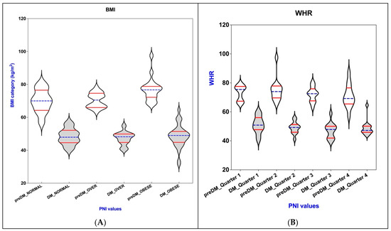 Furthermore, the subgroup with a PNI below 72.69 exhibited increases in body weight and hip circumference (p = 0.007 and p = 0.048, respectively). Additionally, BMI and HDL-c demonstrated statistically significant differences (p = 0.013 and p = 0.048, respectively) between the two prediabetic subgroups, after adjusting for the PNI. This nutritional and inflammatory condition is supported by the mean levels of ALB, which displayed significantly lower values (p < 0.0001).
