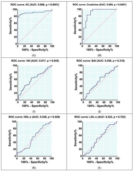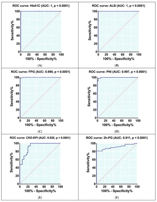 Receiver operating characteristic (ROC) curves were employed to assess the sensitivity and specificity of various parameters, including HbA1c, ALB, FPG, PNI, CKD-EPI, 2hPG, AC, creatinine, VAI, BAI, TC, HDL-c, and LDL-c.