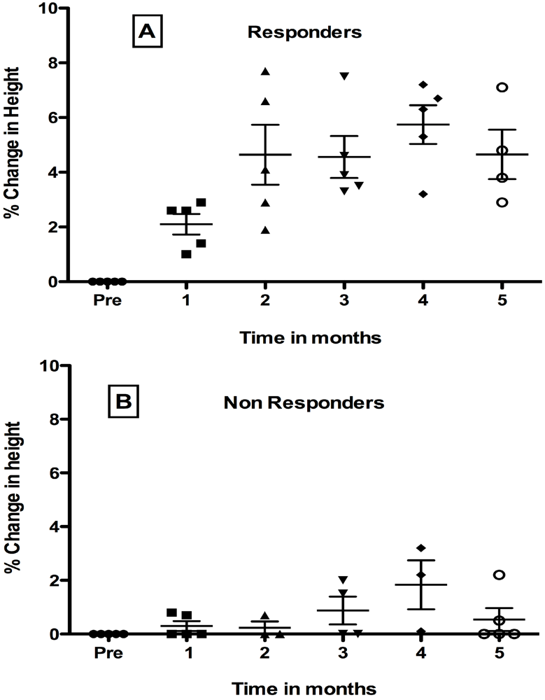 Tukey’s post-test analysis showed that percent increase in height was significant for responders (panel A) at post months 2, 3, 5 (p < 0.001), and 4 (p < 0.0001) compared to the pretreatment period, but were not yet significant at the first post treatment month. In contrast, for non-responders shown in panel B, overall variance was not significant by 1-way ANOVA.