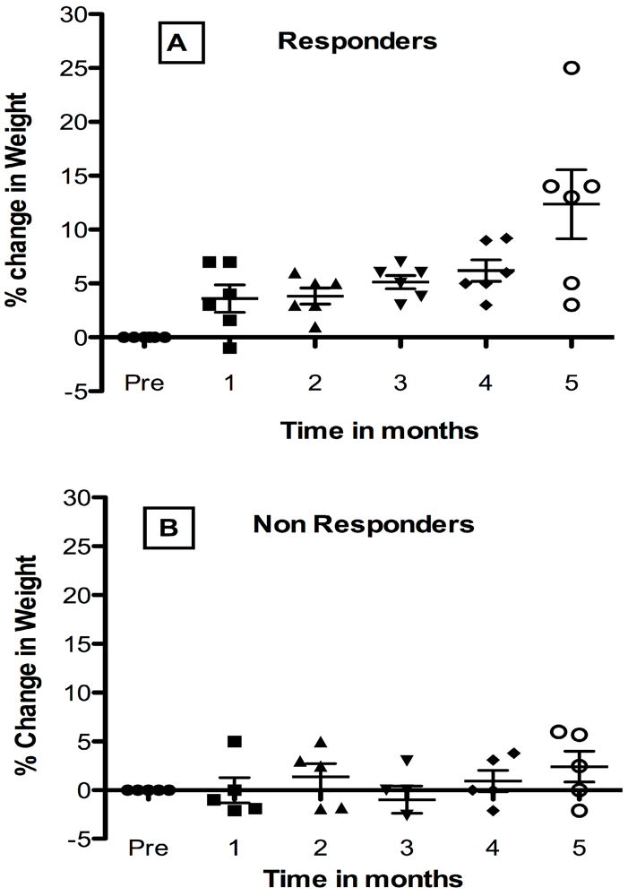 Differences between pretreatment weight and percent change in weight post treatment were significant at post-month 5 compared to pretreatment (p < 0.0001) by Tukey’s post ANOVA analysis. Pair-wise comparisons between later post-months and early months were significant, including post month 5 compared to post-month 1 (p < 0.0001), or post month 2 (p < 0.001). Among the non-responder group overall differences among pre and post treatment weights were not significant by 1-way ANOVA. Examination of Figure 2, suggests that this was probably due to greater recurrent weight loss in the non-responders. Changes were not made to anti HIV-1 therapy for any child during the study period. Growth improvement occurred without reduction in viral load. Further study of the responders in comparison to the non-responders showed that the non-responders were on average older with a mean age of 10 years compared to responders whose average age was about 4 years of age. The younger responders also had a higher viral load. Overall the study indicates the potential benefit of probiotic supplementation in children with AIDS who have growth abnormalities.