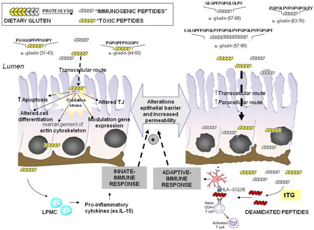 An interplay between innate and adaptive immune responses to ingested gluten [5,6] is involved in CD. Developments in proteomics have provided an important contribution to the understanding of the biochemical and immunological aspects and the mechanisms involved in the toxicity of prolamins [7]. It has been demonstrated that the gliadin sequence contains regions which play a special role in CD pathogenesis: exert a cytotoxic activity or immunomodulatory activity. Other regions trigger oxidative stress and induce the release of pro-inflammatory cytokines [8,9]. As a consequence, elimination of gluten from the diet (gluten free diet, GDF) results in a clinical improvement in CD patients.