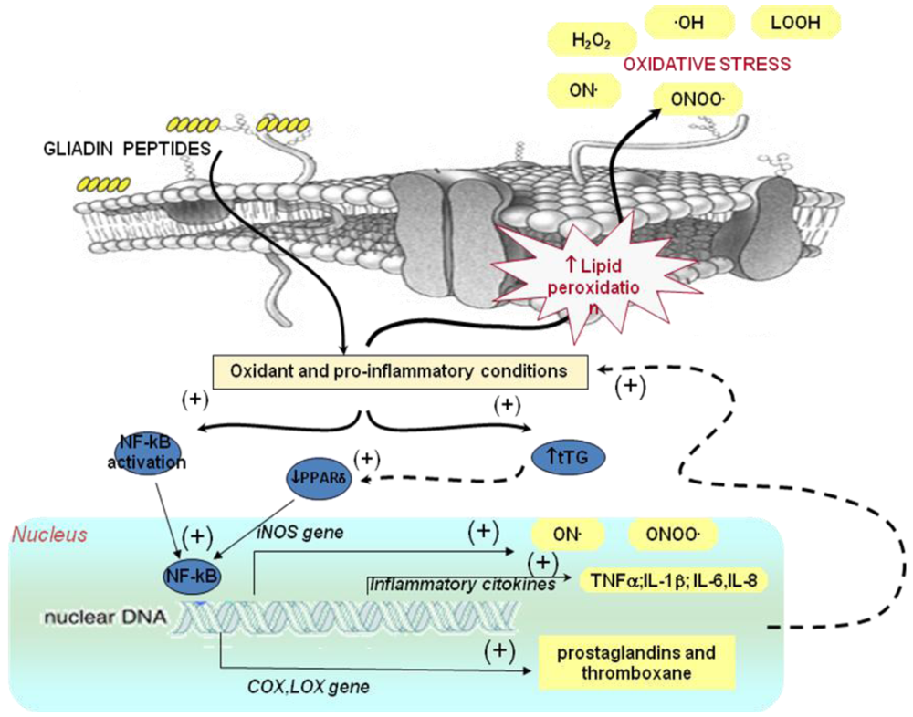 Several studies have demonstrated that gliadin peptides are able to modulate gene expression in several cellular models [57,58]. The increased levels of ROS is involved in the reduced degradation of tTG by the ubiquitine-proteasome system, thus leading to increased tTG protein levels in susceptible targets as coeliac mucosa. An uncontrolled activation of the ROS-tTG axis induced by P31–43 leads to down-regulation of PPARγ with a derangement of the appropriate control of inflammation [59,60] (Figure 2). A down-regulation of PPARγ in CD subjects is confirmed by proteomic analysis of duodenal biopsies from celiac subjects [61]. In fact PPARγ receptor produced by several cell types, including epithelial cells, negatively regulates inflammatory gene expression by “transrepressing” inflammatory responses and even by modulating oxidative stress [28,59]. The increased secretion of inflammatory cytokines may, in turn, derange intestinal permeability and enhance the toxic effects of environmental triggers [57]. It has been hypothesized that the down-regulation of PPARγ may also contribute to NF-κB activation (Figure 2). In celiac disease, pro-inflammatory cytokines, adhesion molecules, and enzymes whose gene expression is known to be regulated by NF-κB are involved [57,62]. The synthesis of NF-κB and other transcription factors is dependent also on the intracellular redox state [63] and can promote synergistically transcriptional activity of pro-inflammatory genes [64]. In fact an increased expression of cycloxygenase-2 (COX-2), cytosolic phospholipase A2 (cPLA2) activity and IL-8 release in culture medium have been observed in cells incubated in the presence of gliadin peptides [58,65]. Moreover, in IFN-γ-stimulated RAW 264.7 macrophages, gliadin increases iNOS gene expression through a mechanism involving NF-κB and other transcription factors (IRF-1 and STAT-1α) [57,66] (Figure 2). An increased expression of several cytokines was observed in the epithelium of patients with active celiac disease [67,68]. Moreover, as aforementioned, patients with active CD and those on a gluten free diet have significantly higher levels of proinflammatory cytokines in the plasma, such as INF-γ, interleukin (IL)-1β, tumor necrosis factor-α (TNF-α), IL-6 and IL-8 compared to no celiac subjects [69].