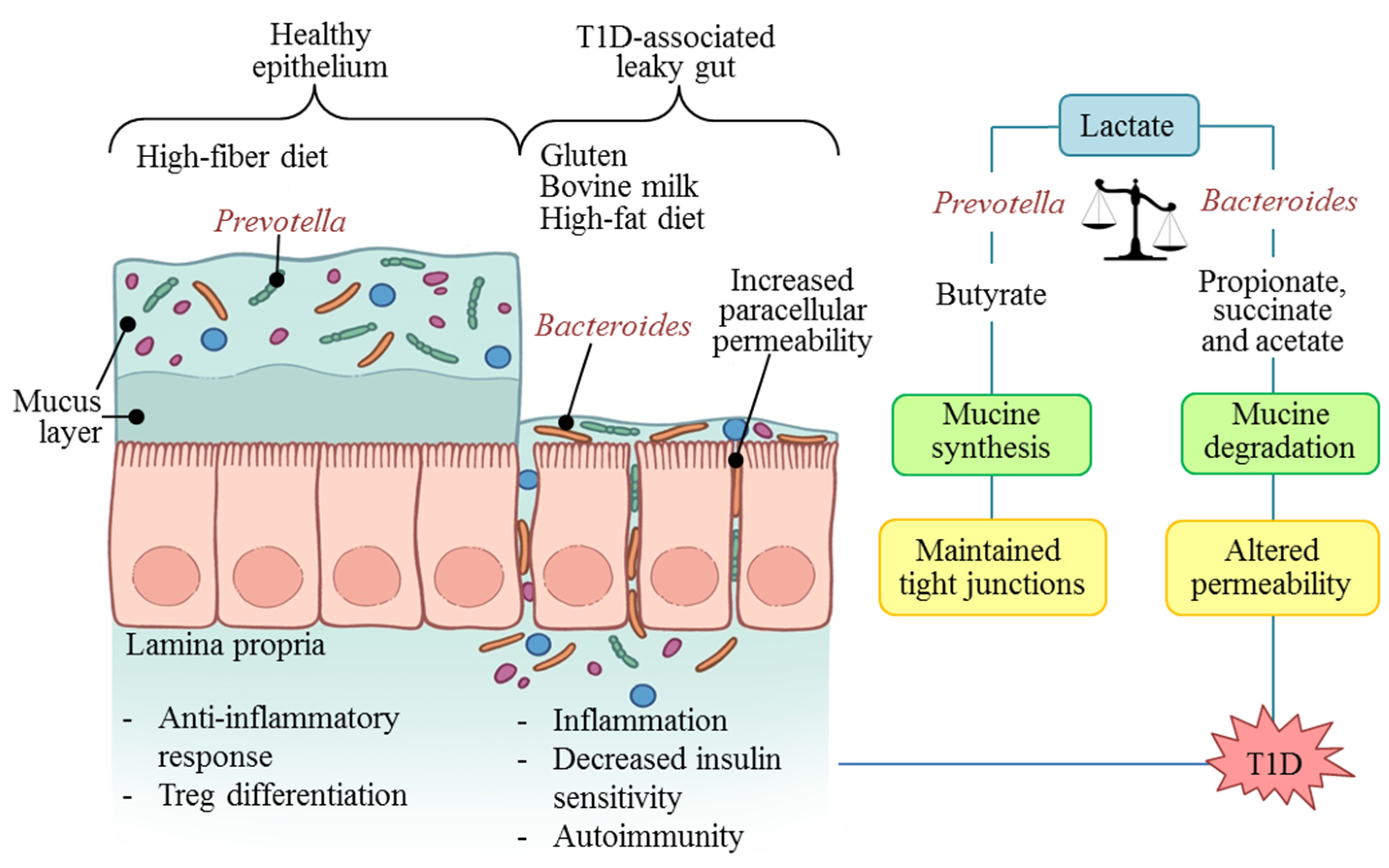 The lactate model appears to be the strongest possible explanation for understanding the link between T1D and dysbiosis (Figure 1). According to this model, the presence of lactic acid- and butyrate-producing bacteria such as Prevotella and Akkermansia helps to maintain a healthy epithelium. This is because butyrate contributes to mucin synthesis and to the assembly of tight junctions [53]. These bacteria were common in the microbiota of healthy children around the world [9,10,11,12,15,50]. In contrast, when microorganisms such as Bacteroides and Veillonella are harbored in abundance, this substrate follows the pathway to succinate, acetate, and propionate. These products compromise mucin synthesis and increase paracellular permeability by altering the tight junctions [50].