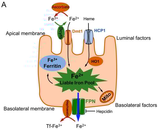 Before iron can fulfill its crucial biological roles, it must be absorbed across intestinal enterocytes into the blood. Dietary iron from animal sources (blood and heme-containing proteins) is absorbed better than iron from plant sources (mitochondrial heme) [10,11]. Both heme-bound iron and ionic iron are absorbed at the apical surface of duodenal enterocytes (Figure 1). Ionic iron (Fe3+) is not bioavailable and must be reduced to Fe2+ by the duodenal enzyme cytochrome b reductase (Dcytb), a membrane-bound ferroxidase expressed at the duodenal brush border; Fe2+ can then be absorbed via divalent metal transporter 1 (DMT1), an enzyme that also transports other metals, including manganese, zinc, copper, and cobalt [1,2].