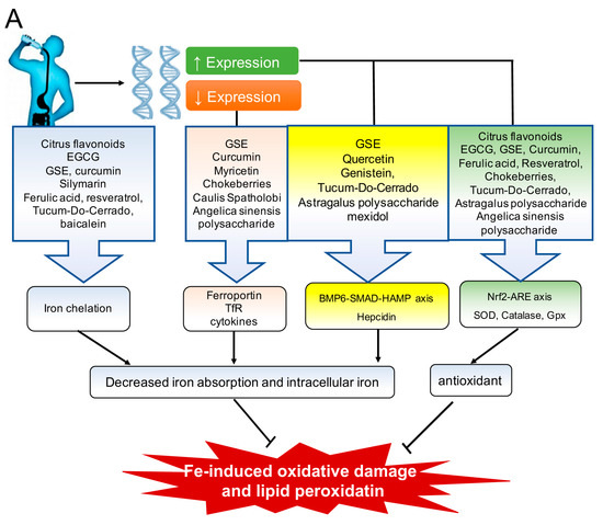 Cerrado plant species are edible antioxidant-rich plants commonly found in Brazil. Among these species, the extract of the fruit of the tucum-do-cerrado plant (a fruit with a purple skin, whitish pulp, and a large seed) was shown to attenuate iron-induced increases in serum and tissue iron levels, transferrin saturation, and lipid oxidation (by increasing the expression of intestinal Nrf2 and hepatic hepcidin, ferritin, heme oxygenase 1 [Hmox1], NADPH dehydrogenase quinone 1 [Nqo1], Nrf2, and Bmp6), ultimately increasing the activity of antioxidant enzymes, including catalase, glutathione reductase, and GPx [82]. The authors found a general correlation between reduced oxidative damage and iron availability. Similarly, baicalein and baicalin are two major bioactive compounds with antioxidative properties found in the Chinese herb Scutellaria baicalensis. For example, in an in vitro assay, baicalein scavenged iron and inhibited the iron-mediated Fenton reaction under physiological conditions, thereby preventing oxidative damage [83]. Another Chinese herb, Caulis Spatholobi, is traditionally used to manage anemia. In Huh7 cells, this compound inhibits the expression of hepcidin, BMP6, and SMAD1/5/8; in mice, it reduces hepatic iron levels and increases serum iron levels by inhibiting hepcidin expression [84].