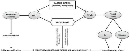 Hypoxia-related cardiovascular pathologies, such as myocardial infarction, stroke, peripheral vascular disease and renal ischemia, are among the most frequent causes of death and disability []. Hypoxia is defined as the threshold where the oxygen concentration is a limiting factor for normal cellular processes, including ATP synthesis. The integration of local responses defines hypoxia as a paradigm of reactions affecting the entire body []. Subsequently, an oxygen gradient arises between affected and non-affected tissues, stimulating the migration and proliferation of endothelial cells and fibroblasts, thereby reconstituting normal oxygen supply by increasing perfusion []. If this process fails, a prolonged inadequate vascular supply of oxygen leads to chronic hypoxia and can cause chronic diseases. Conversely, some cardiovascular diseases are related to the re-exposure to physiologic or supra-normal oxygen concentrations after a hypoxic insult, which constitute the basis for ischemia–reperfusion injury. Oxidative stress (OS) seems to be a common pathway in several morbid states in which myocardial injury is the primary determinant. In this review, the involvement of oxidative stress in cardiovascular disease is explored and redox-based strategies are reviewed in representative conditions that serve as prototypical models for antioxidant therapies development.