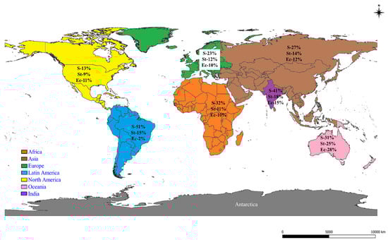 World map showing the continent-wise prevalence of Staphylococcus species (S), Streptococcus species (St), and Escherichia coli (Ec).