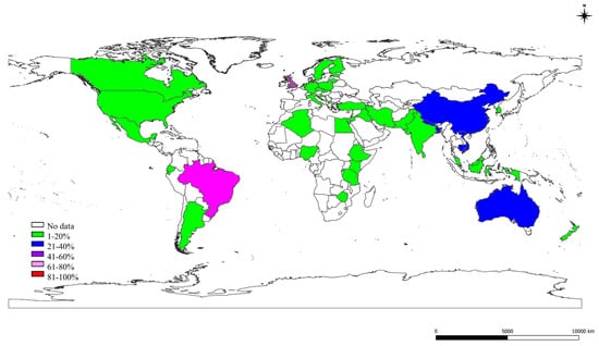 The details of S, St, and Ec prevalence estimates obtained for various countries of the world analyzed by meta-analysis are presented in Figure 3, Figure 4 and Figure 5, respectively. The S prevalence was highest in Trinidad and Tobago (98%), followed by Sri Lanka (90%); in other countries, a low prevalence was observed in Vietnam (5%). A higher St prevalence was observed in Brazil (67%), followed by the United Kingdom (49%); there was a low prevalence in other countries like Jordan (1%), Tanzania (2%), Zimbabwe (3%). The Ec prevalence was high in Australia (28%) and Iraq (24%), and it was low in Croatia and Rwanda (1%), as shown in Figure 5. The countrywide S prevalence studies showed a highly significant (p < 0.01) difference based on Cochran Q statistics for the various countries except for Canada, Iraq, Kenya, and Netherlands with a significant (p < 0.05) difference, and there was no significant difference for Algeria, Indonesia, and Italy—specifying no heterogeneity in studies. A highly significant (p < 0.01) difference for Cochran Q values for St prevalence studies was observed except for Germany; Nigeria revealed a significant (p < 0.05) difference, and Algeria, Czech Republic, Italy, Jordan, and Kenya showed no significant differences.