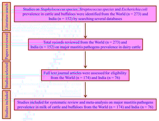 The cattle and buffalo population in the world were 1489 and 206 million, respectively, in 2018, as reported by the Food and Agricultural Organization (FAO), Rome. The United States of America (USA) produced 82 million tons of cattle milk in 2018 and ranked first in the world, followed by India with 47 million tons; India ranked first in the total (cattle and buffalo) milk production in the world []. The per capita consumption of milk was highest in Belarus (111.09 kg) in 2018 []. In the world, India ranks first for both buffalo milk production (55 million tons) and buffalo population. In 2018, Brazil had 193.5 million cattle, making it first ranked in the world, while India ranked second []. In India, the cattle and buffalo populations were 192.5 and 109.8 million, respectively, out of a total livestock population of 535.8 million in 2019, as reported in the 20th Livestock Census report. In 2019, the per capita availability of milk was 394 grams per day, and 187.75 million tons comprised the total milk production, as reported by the Ministry of Fisheries, Animal Husbandry, and Dairying, Government of India, New Delhi []. The major pathogens causing mastitis could be attributed to Staphylococcus aureus, Streptococcus agalactiae, Corynebacterium bovis, Mycoplasma species, Streptococcus uberis [], coliforms (Escherichia coli, Klebsiella species, and Enterobacter aerogenes), Serratia, Pseudomonas, Proteus species, environmental Streptococci, and Enterobacter species (as described earlier) []. Amongst the bacterial species, Staphylococcus (S), Streptococcus (St), and Escherichia coli (Ec) have been deemed as the major mastitis pathogens in dairy cattle and buffalo. Numerous studies are available on S, St, and Ec prevalence in the milk of cattle and buffalo reported from various geographical locations in several countries of the world, which have indicated highly conflicting results regarding the major mastitis pathogen prevalences. Our previous study analyzed and reported the major mastitis pathogen prevalences in India from 1995 to 2016 by using a meta-analysis []. However, there have been no studies on the prevalence status of three major mastitis pathogens in the world. Keeping that in mind, the present study was undertaken to identify the highly important mastitis pathogens and their prevalence status among the three major mastitis pathogen groups in the milk of cattle and buffalo in the world by using systematic review and a meta-analysis.