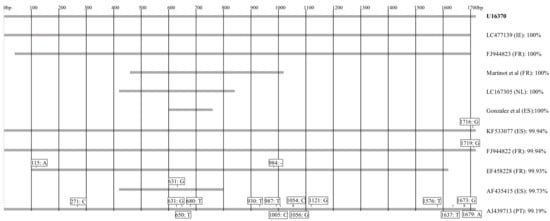 The relative length, positions and heterologies of 18S rRNA sequences of Babesia species isolates from human cases compared to the reference sequence U16370. Numbers refer to positions in the reference sequence. Identity scores are according to Clustal Omega. ‘-’ indicates that the base was missing.