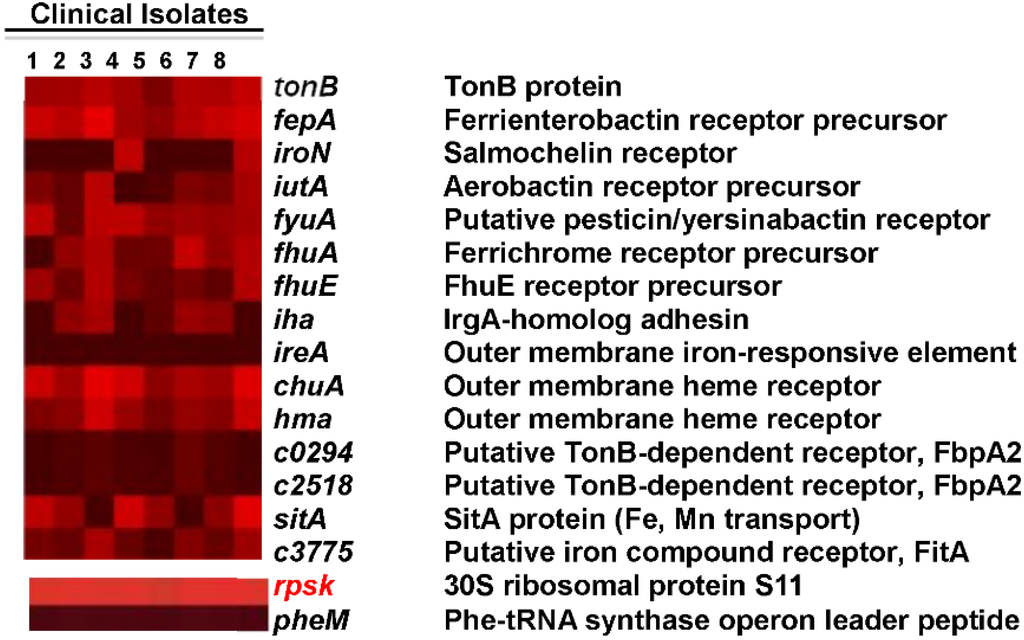 Virulence gene expression was measured for E. coli in the urine of patients with UTI. We used the CFT073-specific microarray to measure global gene expression in eight E. coli isolates stabilized immediately after collection of urine from eight women presenting at the clinic with cystitis []. Gene expression profiles were compared to those of the same E. coli isolates cultured statically to exponential phase in pooled, sterilized human urine ex vivo. Known fitness factors, including iron acquisition, were highly expressed during human UTI (Figure 1). While these findings were highly correlated with data obtained from the murine in vivo transcriptome (r = 0.589; p < 0.0001) (described above), host-specific differences were observed. Findings presented in this study provide insight into the metabolic and pathogenic profile of UPEC in urine from women with UTI and represent the first transcriptome analysis for any pathogenic E. coli during a naturally occurring infection in humans []. RNA-Seq of RNA from E. coli collected (and stabilized immediately) directly from the urine of five women with documented uncomplicated UTI with symptoms of cystitis [] verify that iron acquisition genes are expressed at high levels by E. coli during UTIs in women. While ireA was not present or well expressed in the women from the urology clinic cystitis patients, it was present and well expressed in RNA-seq samples from the women with uncomplicated cystitis and is prevalent in the collection of 315 E. coli strains [].
