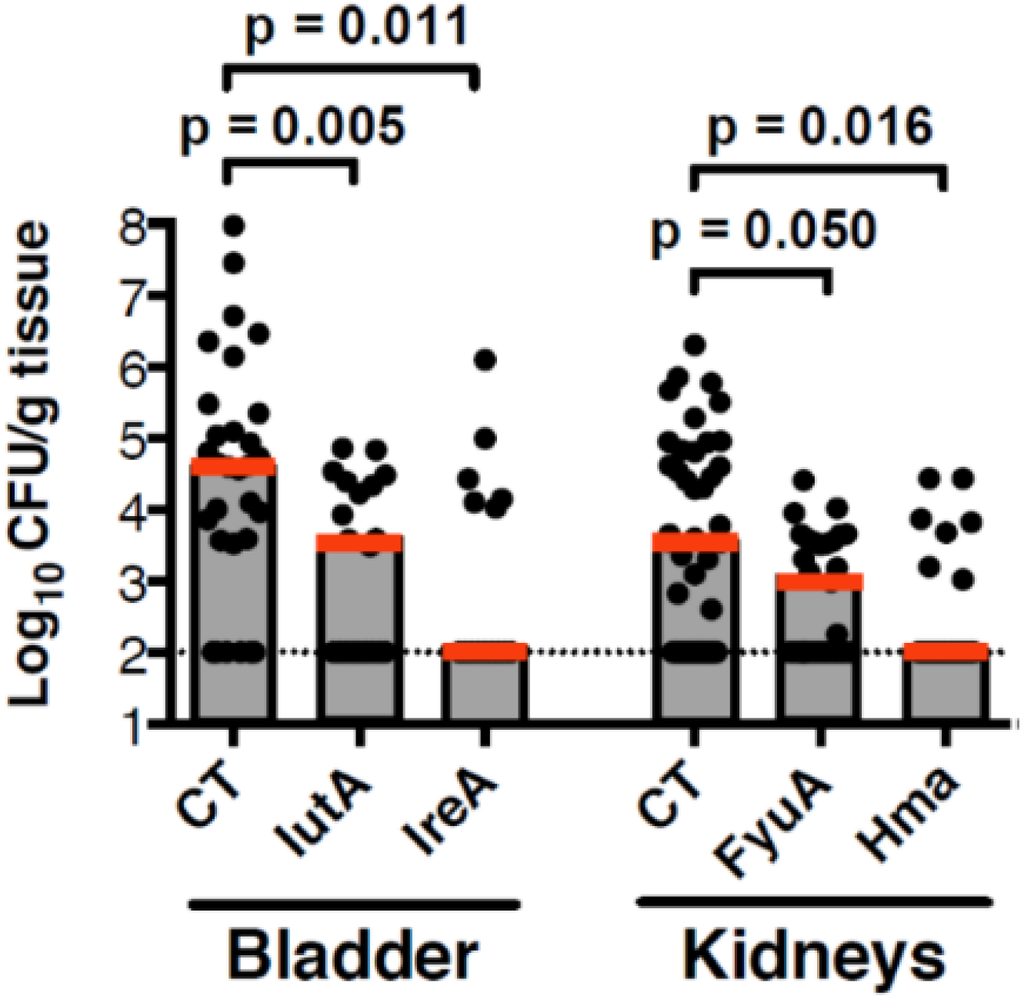 The seven vaccine candidates, ChuA, Hma, Iha, IreA, IroN, FyuA, and IutA, all belong to a functional class of molecules that is involved in iron acquisition, a process critical for pathogenesis in all microbes. Intranasal immunization of CBA/J mice with these outer membrane iron receptors elicited a protective systemic and mucosal immune response that significantly reduced colonization of the bladder and/or kidneys []. The cellular response to vaccination was characterized by the induction and secretion of IFN-γ and IL-17 []. Of the seven potential vaccine candidates, IutA, IreA, FyuA, and Hma provided significant protection from experimental infection (p < 0.035) (Figure 2).