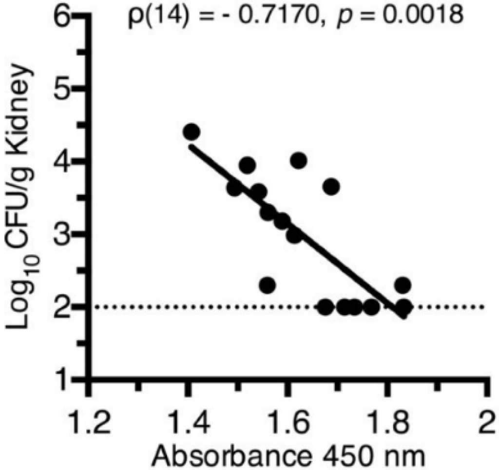 Correlation between vaccine-specific serum IgG titers and reduced bacterial counts in mice immunized with FyuA. Kidney CFUs from immunized and E. coli-challenged mice are plotted against their respective vaccine-specific serum IgG levels as measured by indirect ELISA, where absorbance at 450 nm reflects the relative quantity of vaccine-specific serum IgG. Dotted line indicates the limit of detection (100 CFU/g kidney tissue) for the immunization assay.