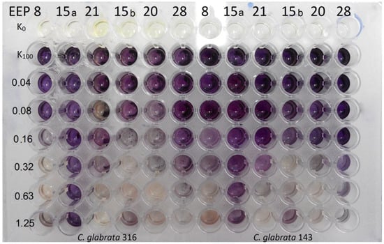 MIC values were determined according to CLSI guidelines [] in medium supplemented with ergosterol. Medium with ergosterol was prepared at the time of the test. The test was performed in microtitration plates as in the case of the routine MIC determination procedure. Ergosterol powder was dissolved in DMSO (dimethyl sulfoxide) containing Tween 80 (1% v/v) to the final concentration of no more than 10% (v/v). The obtained solution was added to RPMI-1640 medium through the 0.2 μm filter, to the final ergosterol concentration of 100 μg/mL. Two-fold serial dilutions of EEPs (concentration in the range 5–0.01% (v/v) were prepared in the RPMI-1640 medium supplemented or not supplemented with ergosterol. Plates were inoculated with cell suspension to the final cell density of 104 CFU/mL and incubated for 24–48 h at 37 °C. Amphotericin B was used instead of EEPs, as a positive control. Investigations were carried out in duplicate. The MIC values were read as the lowest concentration of EEPs or amphotericin B where no growth of yeast was observed. Additionally, the MFC values were determined by picking up small amounts of suspension from each well and culturing on EEP-free solid YPD medium.