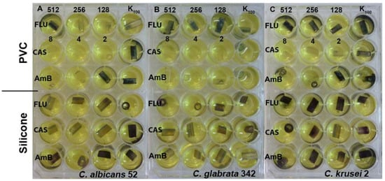 Effect of fluconazole (FLU) in the range of concentration 512–128 μg/mL, caspofungin (CAS) 8–2 μg/mL and amphotericin B (AmB) 8–2 μg/mL on eradication of biofilm formed by (A) C. albicans, (B) C. glabrata and (C) C. krusei clinical isolates from PVC and silicone catheters.