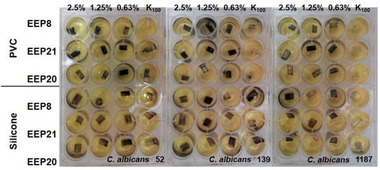 In the next step, the effectiveness of EEPs in eradication of biofilm formed by Candida cells on abiotic surfaces (polystyrene plates, silicone and PVC (Polyvinyl Chloride) catheters) was investigated. Among the 34 clinical isolates of three species from the Candida genus used as model microorganisms in this experiment, the highest adherence ability was found for C. krusei, followed by C. glabrata and the lowest for C. albicans. As a measure of EEPs’ biofilm eradicating ability, the MBEC50 values, i.e., minimal concentrations causing 50% biofilm eradication, measured by the MTT assay, were determined.