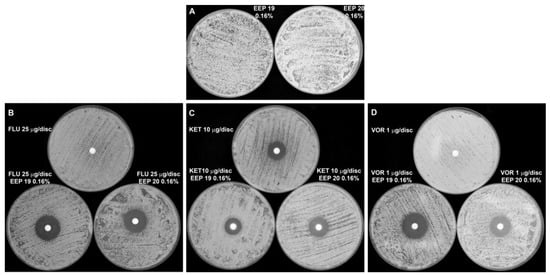 Synergistic growth inhibitory effect of EEPs in combination with azole antifungals against C. albicans clinical isolates. The EEPs were added to the YPD agar medium to final concentration of 0.16% (v/v). Azole antifungals were applied at paper discs. Plates were inoculated with 105 cells/mL and incubated (24 h, 37 °C). (A)—EEPs alone. (B–D)—upper plates: azole antifungals on the discs (no EEPs in agar medium); B, C, D—lower plates: EEPs in the agar medium (EEP 19—left plate and EEP 20—right plate) and azole antifungals on the discs. Azole antifungals concentrations: fluconazole—25 µg/disc (plates B); ketoconazole—10 µg/disc (plates C); voriconazole—1 µg/disc (plates D).