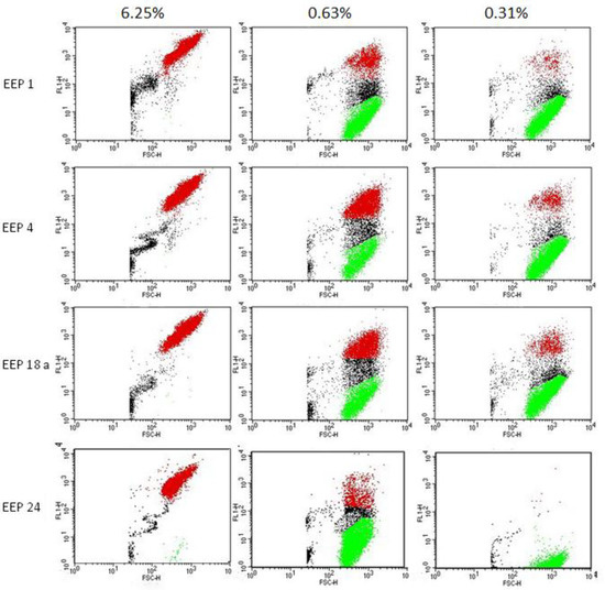 Dose dependent effect of four EEPs on C. albicans cell membrane depolarization. Cells were exposed to the action of EEP in the concentrations corresponding to 10× MFC, 1× MFC and ½× MFC for 1 h. Red points indicate cells with a high level of fluorescence, thus having depolarized membranes, green points with relatively low fluorescence—living cells; between these two gates, there is a group of points indicating apoptotic cells.