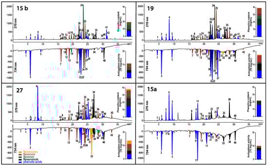 HPLC-DAD chromatograms of polyphenols (top chromatograms at 270 nm) along with profiles of antioxidants detected online with ABTS (2,2′-azino-bis(3-ethylbenzothiazoline-6-sulphonic acid) reagent (bottom chromatograms at 734 nm) in four propolis extracts (15 b, 27, 19, 15 a). The content of specific class of polyphenols and their antioxidant activity was presented as bar graphs. For identity of peaks, see Table 13. The range of antifungal activity of the EEPs was 15 b > 27 > 19 >> 15 a, and probably indicate that the presence of flavones and flavonols is crucial for antifungal activity.
