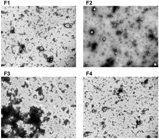 TEM images of NLCs (F1 to F4 formulations). The freshly prepared formulations (20 mg MM lipid/mL) were diluted with Milli-Q water (1:10) and the contrast was enhanced with phospho-tungstic acid. All images were taken at 30,000× (scale bar = 200 nm).