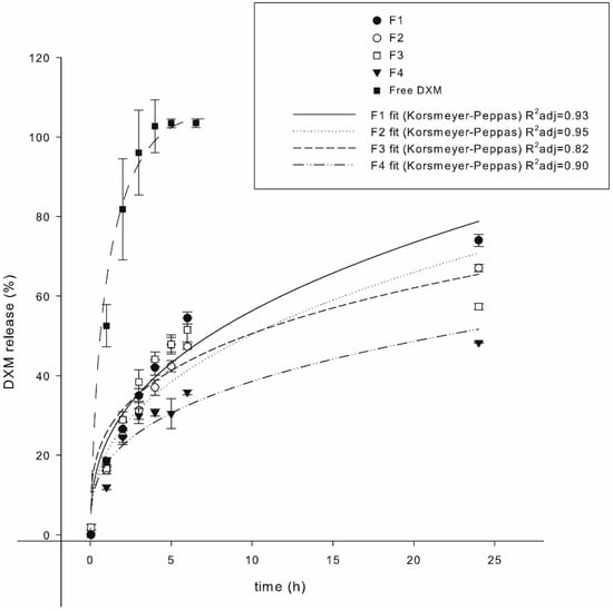 DXM release by NLC formulations was determined to study drug kinetic mechanisms (Figure 2). All formulations showed a typical bi-phasic release profile, with a burst release during the first 3 h followed by a sustained release at a lower rate. Additionally, all formulations showed a longer release profile compared to the soluble DXM control. An increase in the content of liquid oil in the matrix resulted in a slower release of DXM. Thus, 74.0% (F1), 67.1% (F2), 57.4% (F3), 48.3% (F4) of DXM was released in the course of a 24 h incubation, respectively. In particular, F4 released less than 40% of the drug within 12 h. Formulation-specific DXM release kinetics were fitted with different established models to delineate drug release mechanisms: First Order, Higuchi, Korsmeyer-Peppas, and Hixon and Crowell (Table S1). The release model that fitted best to the experimental data was selected according to the calculations of the coefficient of determination (R2). The release of DMX from all tested formulations matched with the Korsmeyer-Peppas model (Figures S1–S4) []. The n-value is indicative of the mechanisms involved in drug release from the matrix. The adjustments resulted in the determination of release exponents (“n”) lower than 0.5 for the various NLC formulations. The experimental data values (dots)according to Korsmeyer-Peppas fitting curves (lines) are depicted in Figure 2.